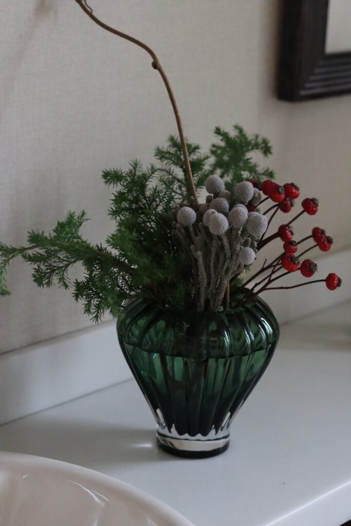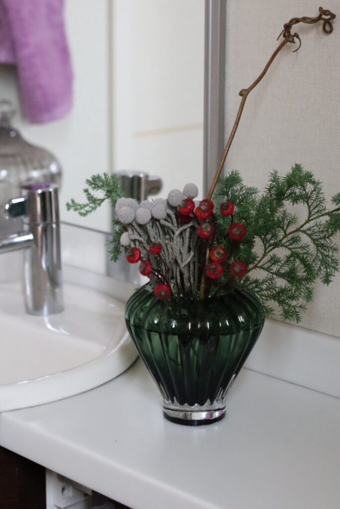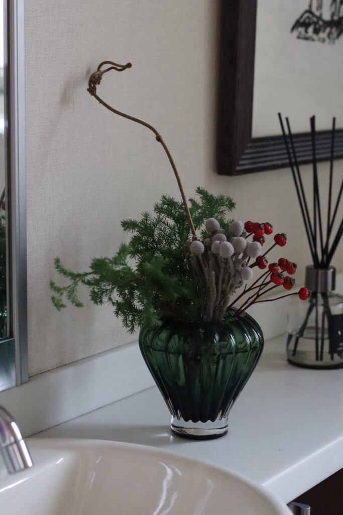 かれこれ何十年使っている我が家の洗面台が、グリーンカラーの花瓶を置いただけで、何だか一気に現代風になりウキウキしました(笑)