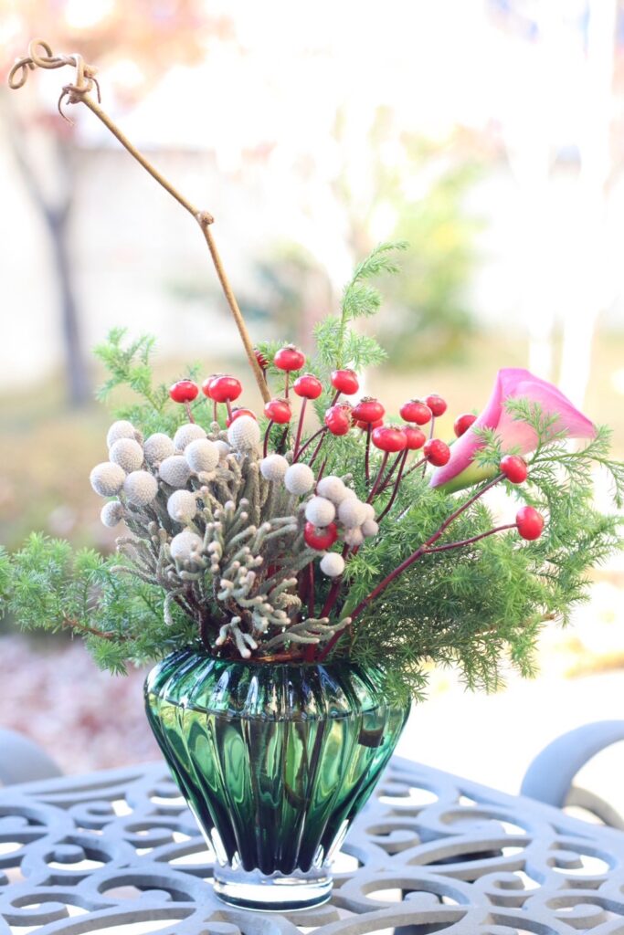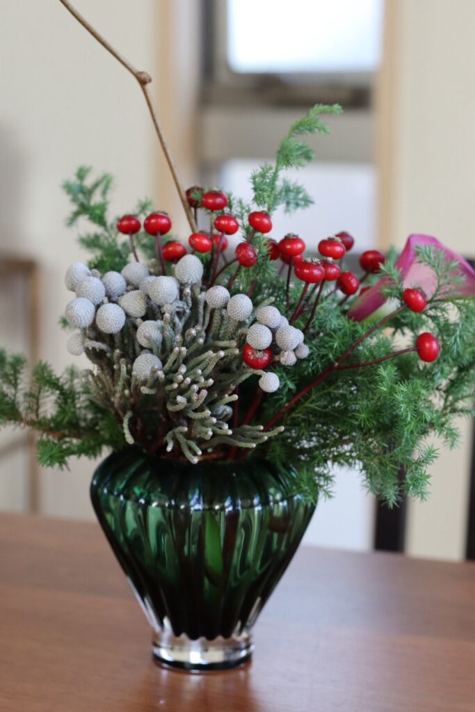 先週は、紅茶教室で使い終わったお花を短くカットして、グリーンカラーの花器に移し替えて楽しみました。