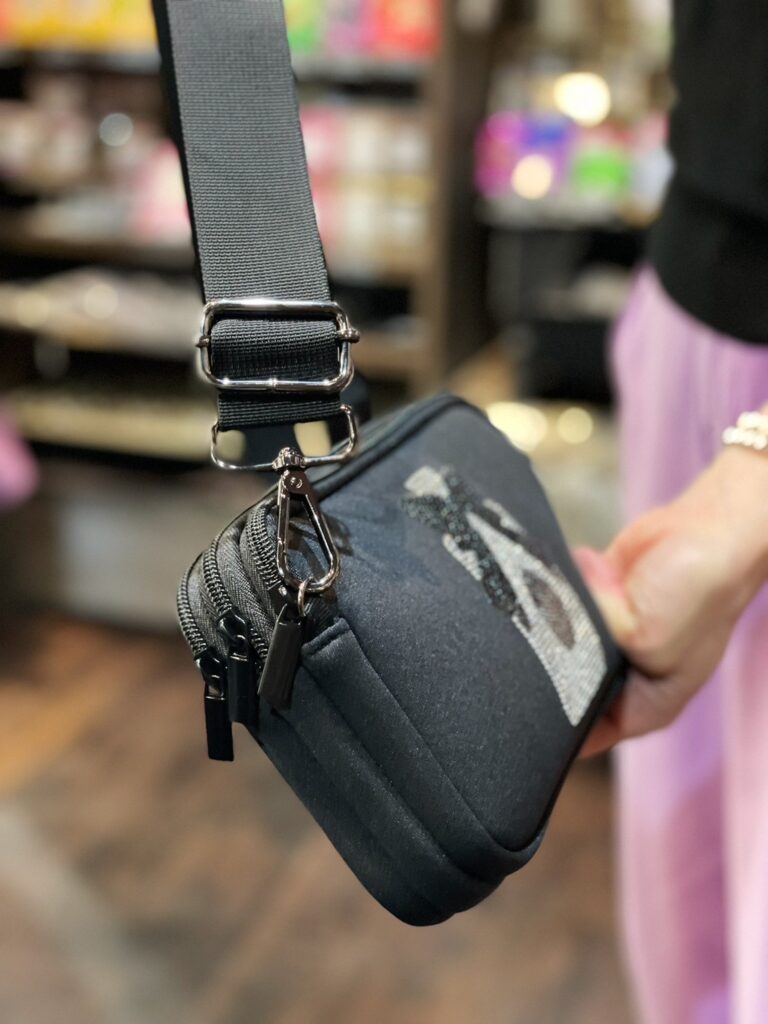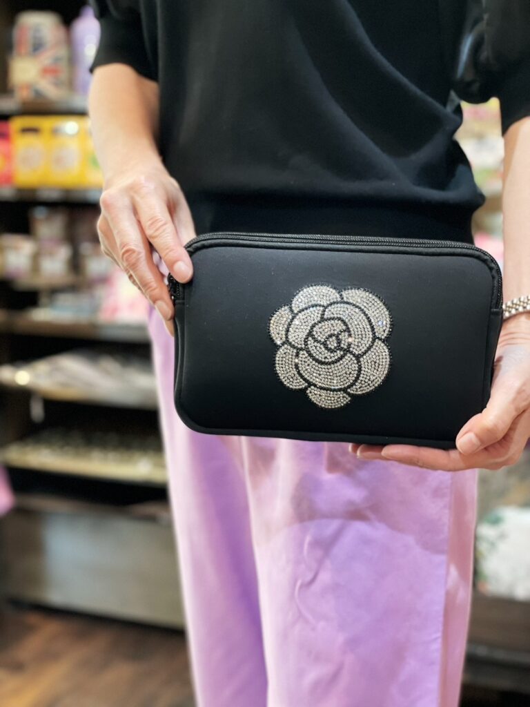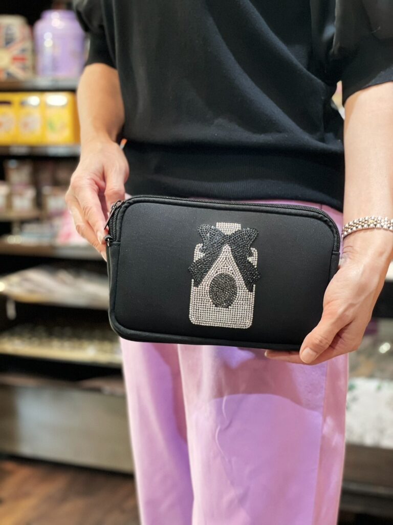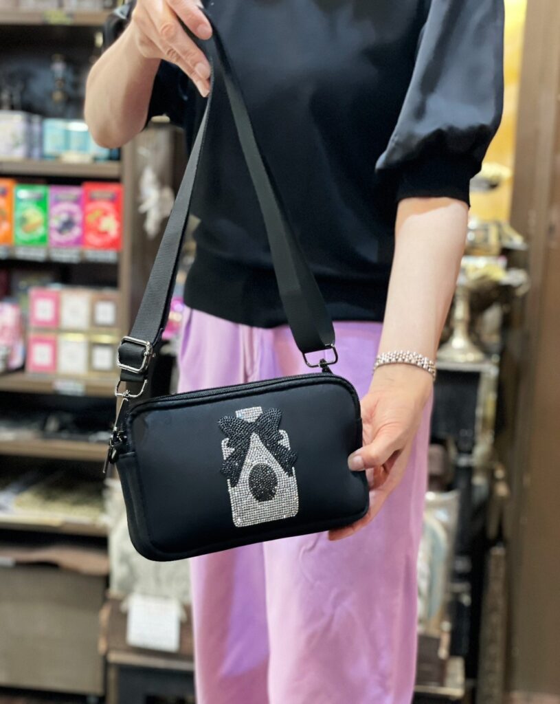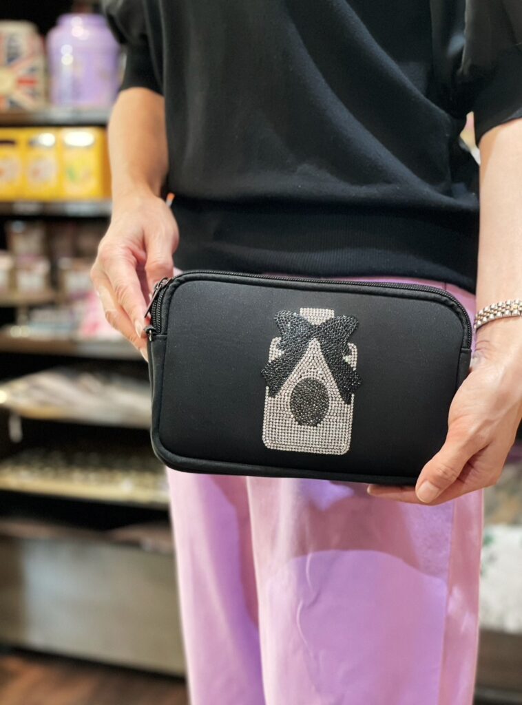 黒ベースの生地にデコレーションされたモチーフが目を惹く可愛らしいデザインです。