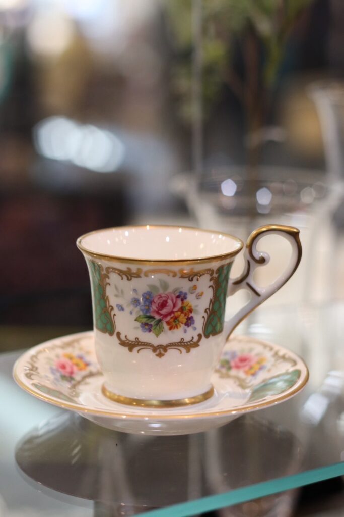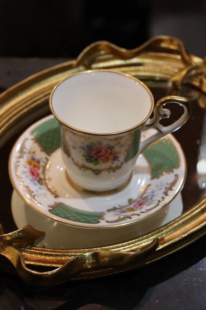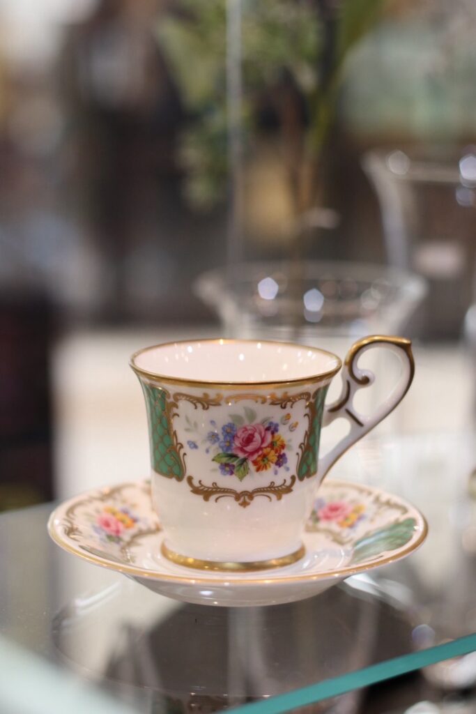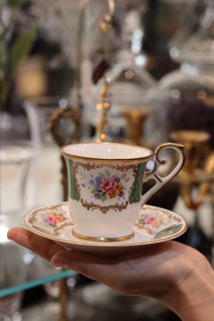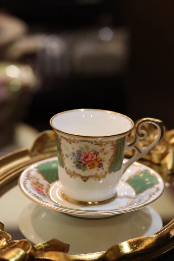透明感あるグリーンのロカイユ模様に薔薇を中心に