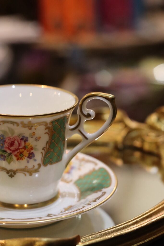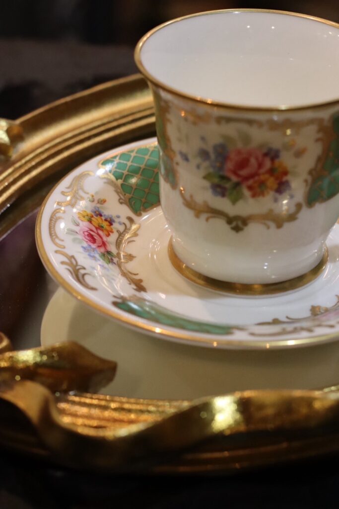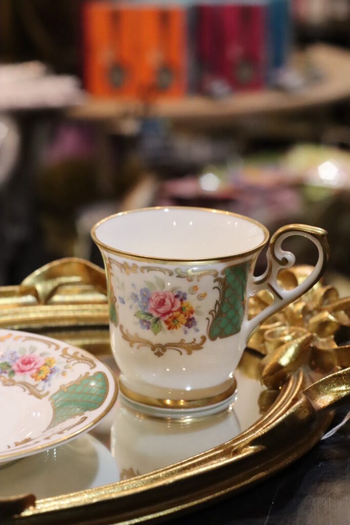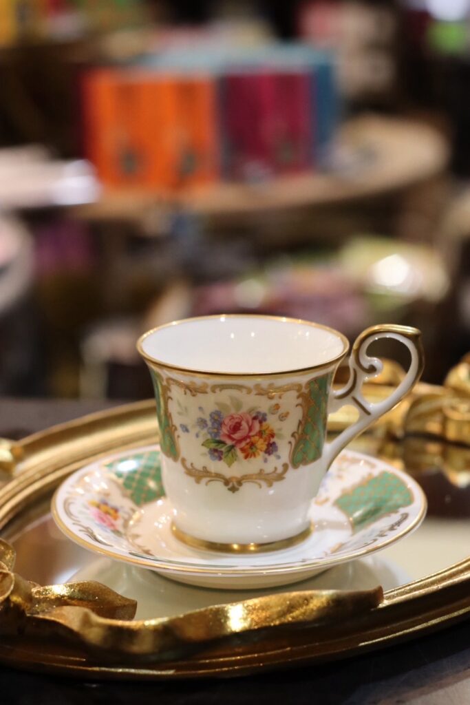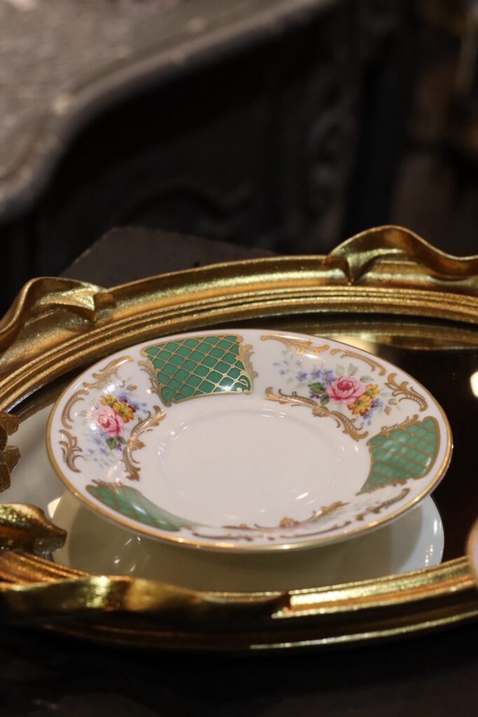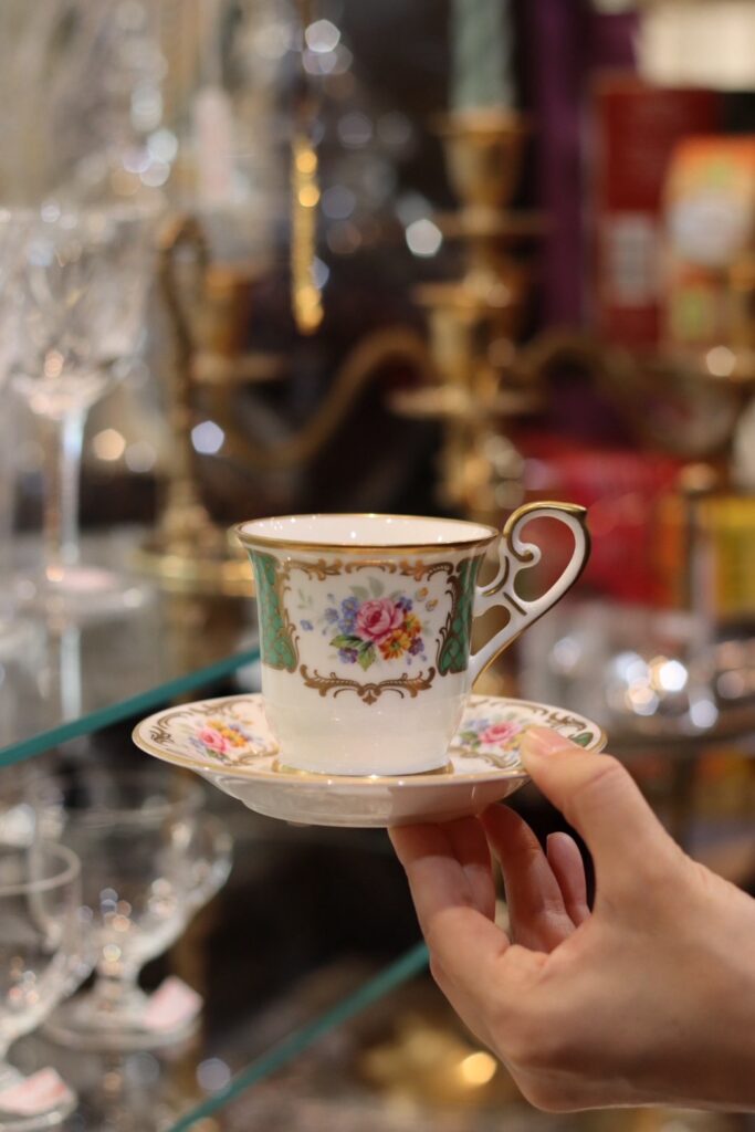 透明感あるグリーンのロカイユ模様に薔薇を中心に